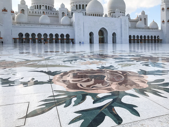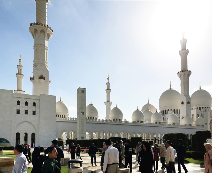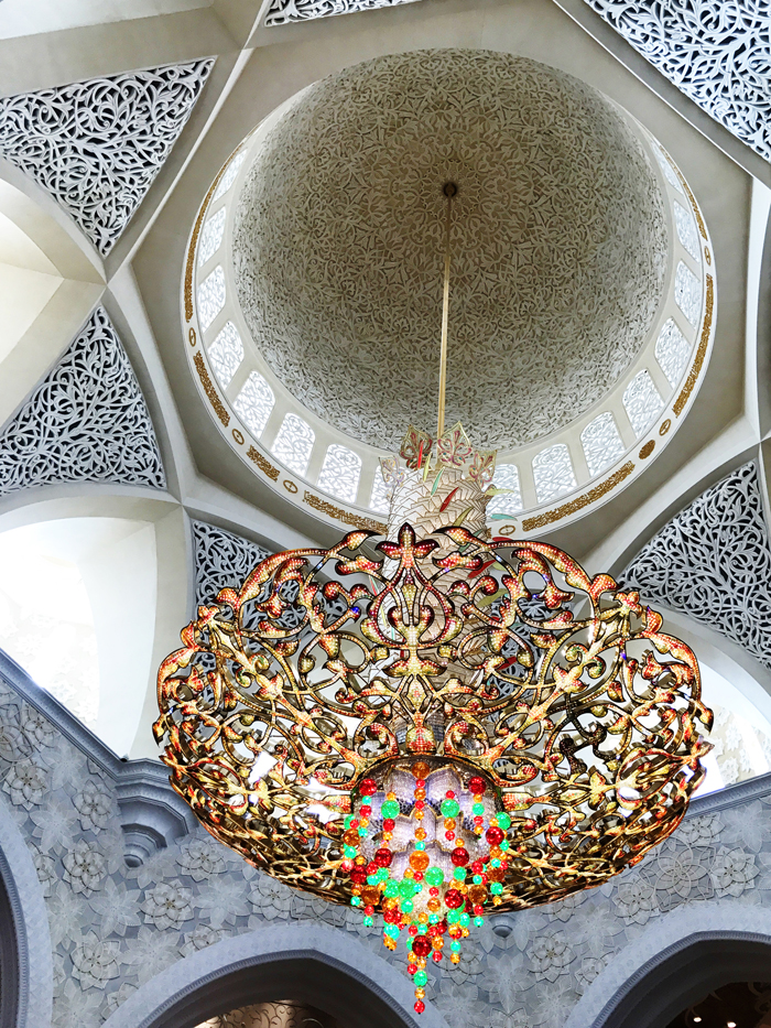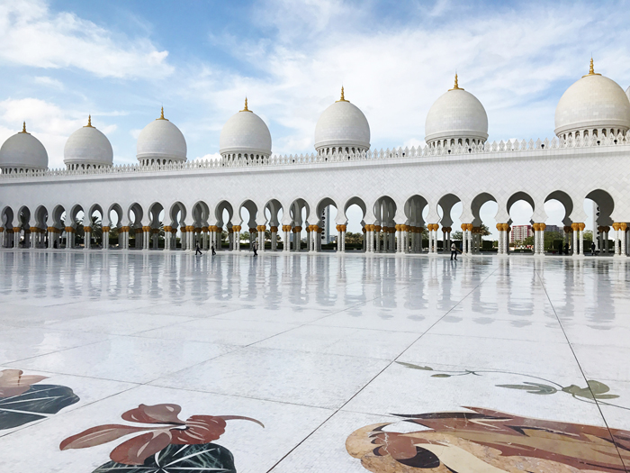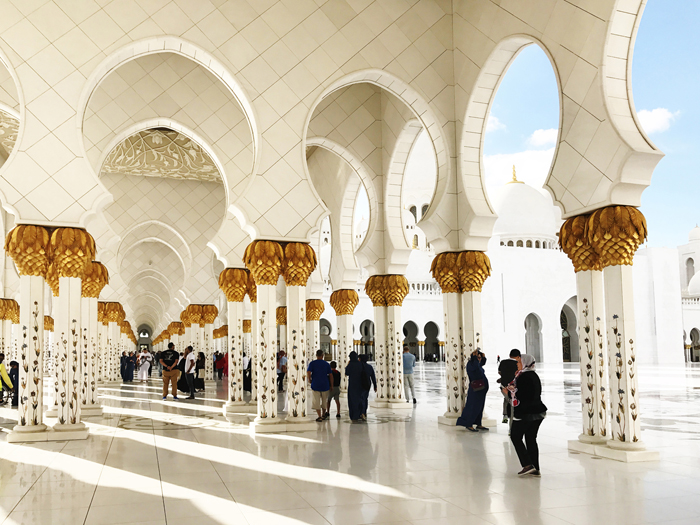 整个清真寺耗资55亿美元和46吨黄金。金箔包裹的圆顶,在落日的余晖下闪闪发光,真是无比雄伟壮观,令人肃然起敬。大清真寺整个建筑群都用来自希腊的汉白玉包裹着,外表通体洁白庄重,非常的庄严肃穆,一尘不染的样子不禁让人想起纯洁、干净、美好、肃穆、灵魂、信仰等等词汇。