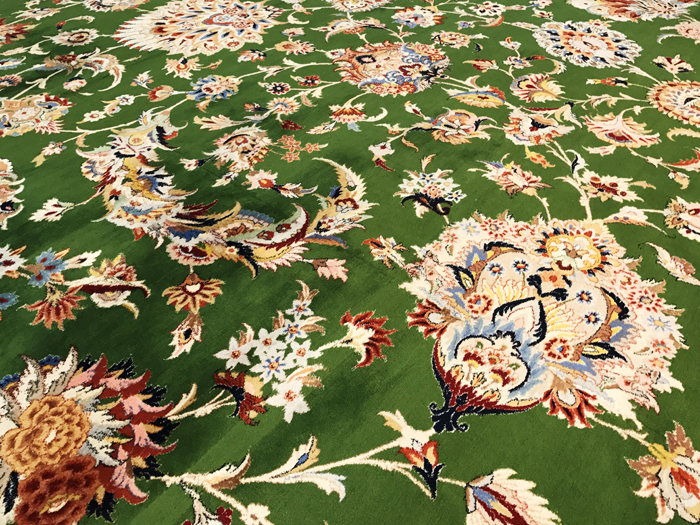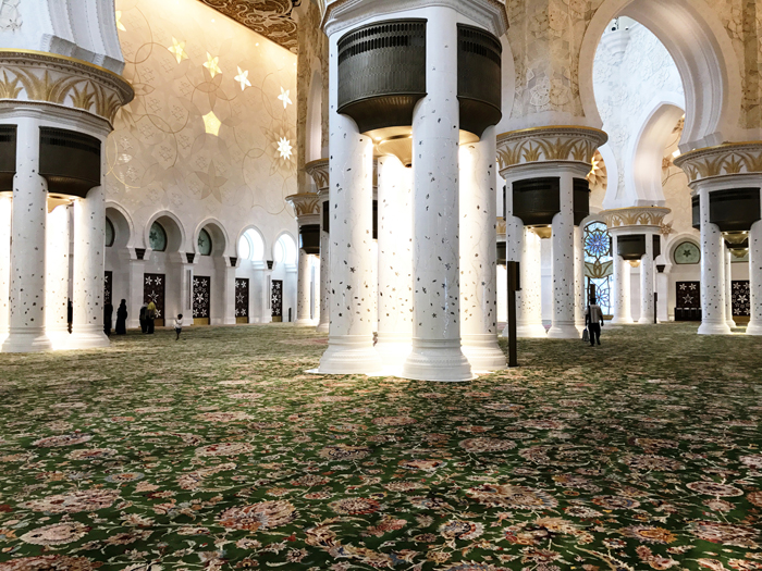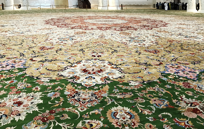 在这个可容纳7126名的主祈祷堂内的地面上,覆盖着被称为世界上最大的手工地毯。地毯是由伊朗艺术家设计,由来自伊朗著名编制地毯的小镇上的1200名技工,用了一年半的时间编制而成。地毯面积总计5627平方米,重达47吨,造价580万美金。
