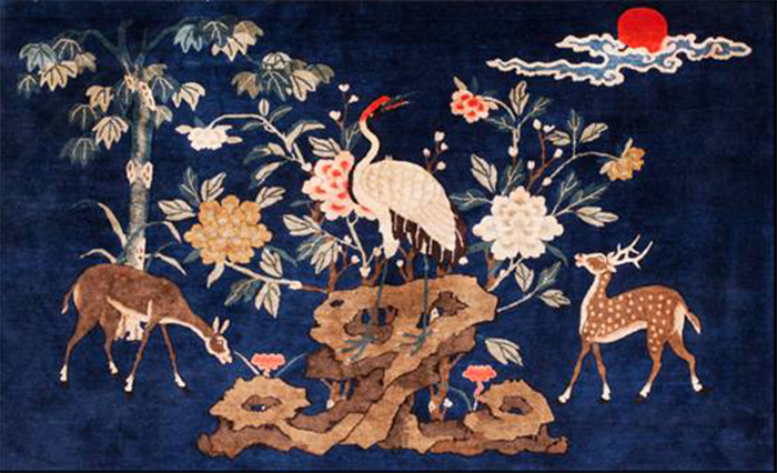 讲到地毯,不能不讲中国的吉祥文化。吉祥文化,伴随着人类的产生和发展是人类物质需求之上的精神追求。物质文明到精神文明推动了社会的进步和发展。中国的农耕社会文明在一定程度上体现了人们对幸福美好生活的想往和追求,吉祥文化就是人们对美好生活追求的表征物和精神的物化。