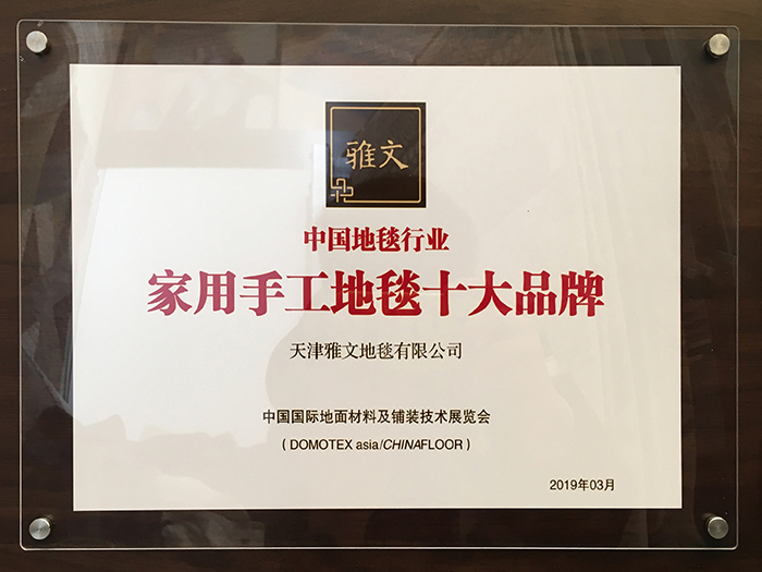 雅文地毯<<家用手工地毯十大品牌>>获奖证书
