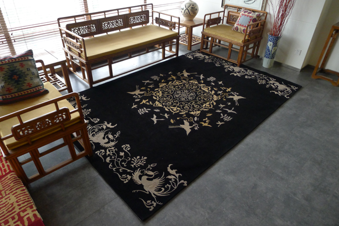 作品图案题材取自盛唐”金银平脱鸟葵花镜“,其构图丰腴精美,纹饰以凤纹和宝相花为主,它们相融交替,寓意吉祥如意,充分反映了大唐盛世的社会繁荣和人们的审美取向。为了更好的体现原作品的艺术风格和工艺特点,除构图外,在配色方面将大地色设定为黑绿色,它富贵典雅,同时对主体纹样起到衬托的作用;运用真丝与纯毛两种材质对比的关系更好的体现了”金银平脱“所特有的工艺效果;在工艺方法通过对丝线的金、银分色,润色使图案由中心向四周发散,向人们传递着吉祥寓意的祈福和美的视觉艺术感受。