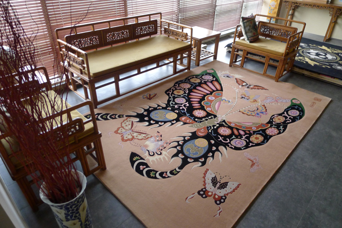 周淑英刻刀下的蔚县剪纸作品构思新颖,意象突出,源于生活。她绘制的《彩蝶图》剪纸作品闻名世界并多次参加各种国际展览活动。雅文公司通过艺术再创造把彩蝶图转化成地毯作品,不仅传承了民间经典艺术,而且为手工地毯设计开拓了新的思路。
