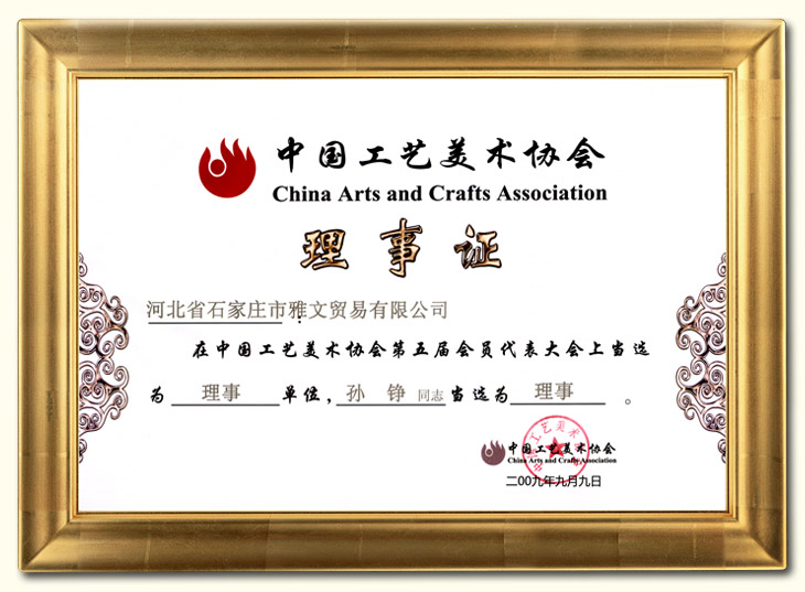 9月,石家庄雅文在中国工艺美术协会第五届会员代表大会上当选为理事单位,艺术总监孙铮当选为理事。