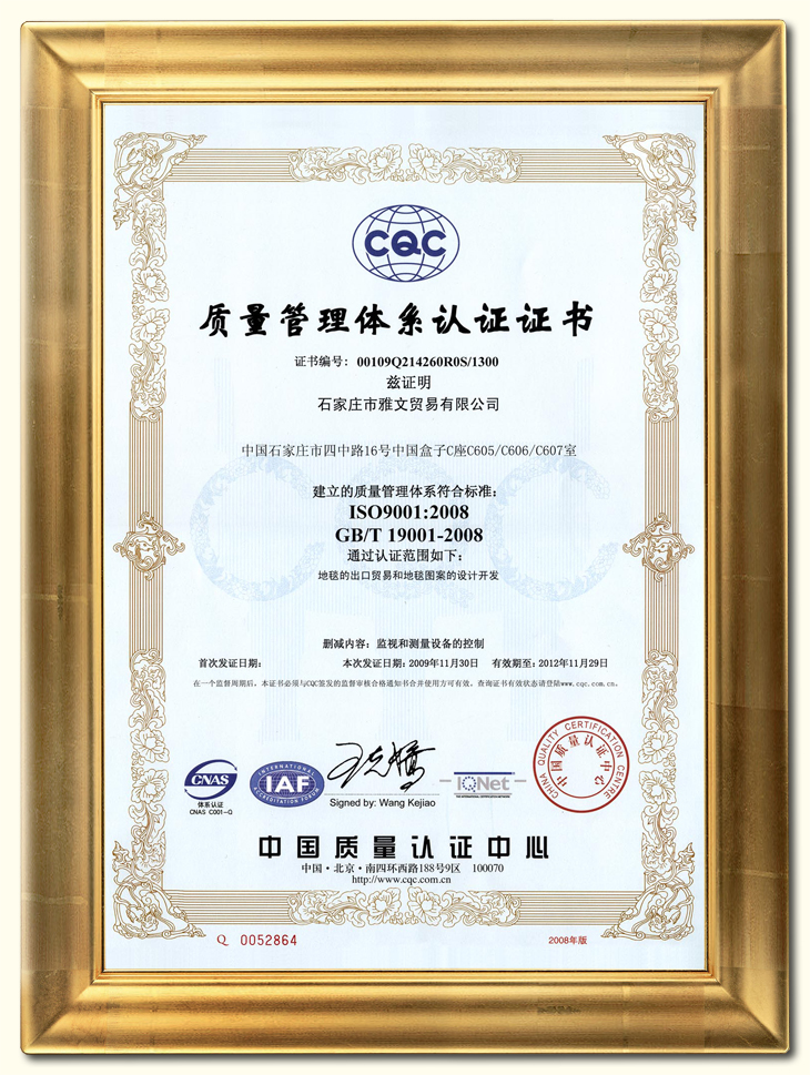 11月,公司建立的质量管理体系符合标准ISO9001:2008 GB/T 19001-2008,通过中国质量认证中心质量管理体系认证。