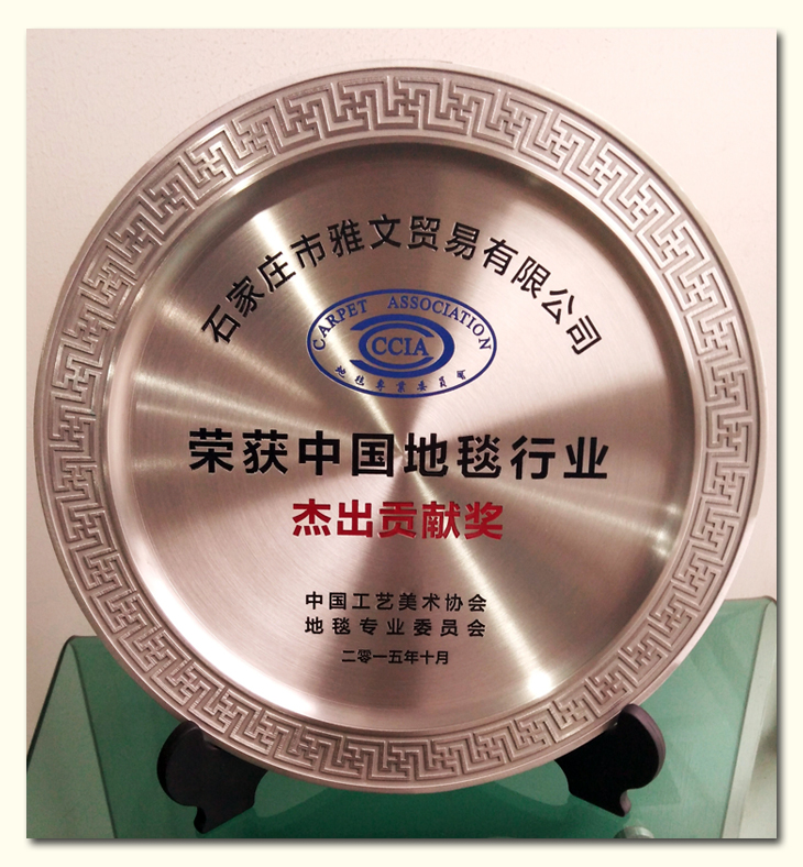 10月,石家庄雅文荣获中国工艺美术协会地毯专业委员会颁发的中国地毯行业杰出贡献奖。